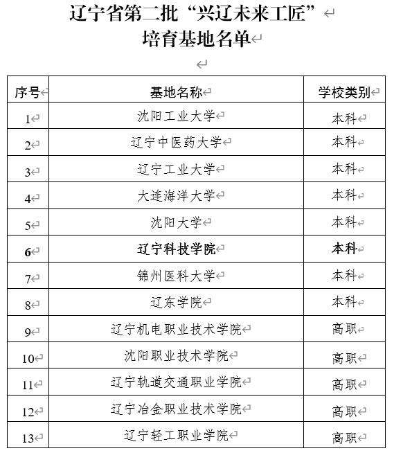 近日,辽宁省教育厅发布《关于公布辽宁省第二批“兴辽未来工匠”培育基地名单的通知》(辽教通[2023]514号),经过高校申报、专家评审、网上公示等程序,本轮共批准13所省内高校立项建设,我校成功入选,获批辽宁省第二批“兴辽未来工匠”培育基地。