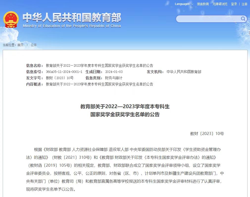 近日,教育部发布《关于2022-2023学年度本专科生国家奖学金获奖学生名单的公告》,我校人文艺术学院胡雨洁、冶金与材料工程学院王思涵等17名同学获此殊荣。