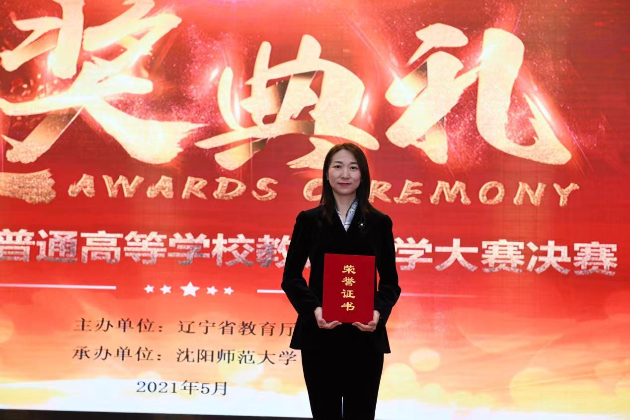 图为韩娇在首届辽宁省教师教学大赛一等奖颁奖典礼现场