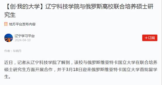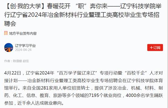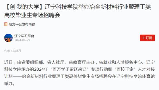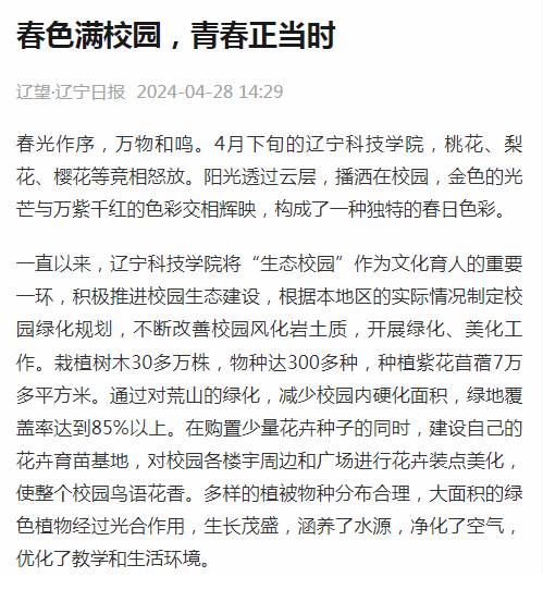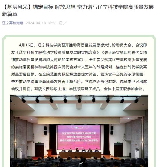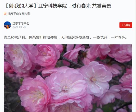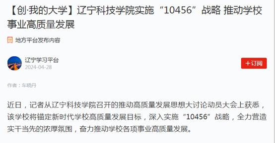 春林初盛,和光同行。自辽宁科技学院第四次党代会胜利召开以来,全校师生斗志昂扬、凝心聚力,干事创业热情高涨,以新担当展现新作为,蹄疾步稳全面推进学校高质量发展。近期,学习强国、辽宁日报、辽宁高校党建、辽宁高校思政、本溪日报等多家主流媒体聚焦辽宁科技学院实施“10456”战略推动学校事业高质量发展、党纪学习教育、举办冶金新材料行业暨理工类高校毕业生专场招聘会、与俄罗斯高校联合培养硕士研究生、校园春景等方面,进行了报道,校内校外、网上网下反响强烈,形成了多声部合唱、多角度共振的浓厚舆论氛围,有力提升了学校的美誉度和影响力,树立了良好的社会声誉和社会形象。