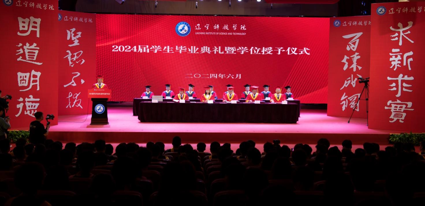 凤凰花开骊歌轻起,云程发轫万里可期。6月28日上午,辽宁科技学院2024届学生毕业典礼暨学位授予仪式在学校大学生活动中心隆重举行。2024届毕业生齐聚一堂共同见证人生的重要时刻,共享辽科人荣光,庆祝圆满完成学业,正式开启逐梦未来新篇章。学校党委书记赵毅、校长李卫民、党委副书记宋明凯、副校长罗旭东、纪委书记闫海军、副校长葛会奇出席典礼。学校学位评定委员会委员、相关职能部门负责人、各学院领导班子成员、全体辅导员、毕业生班主任参加典礼。典礼由葛会奇主持。