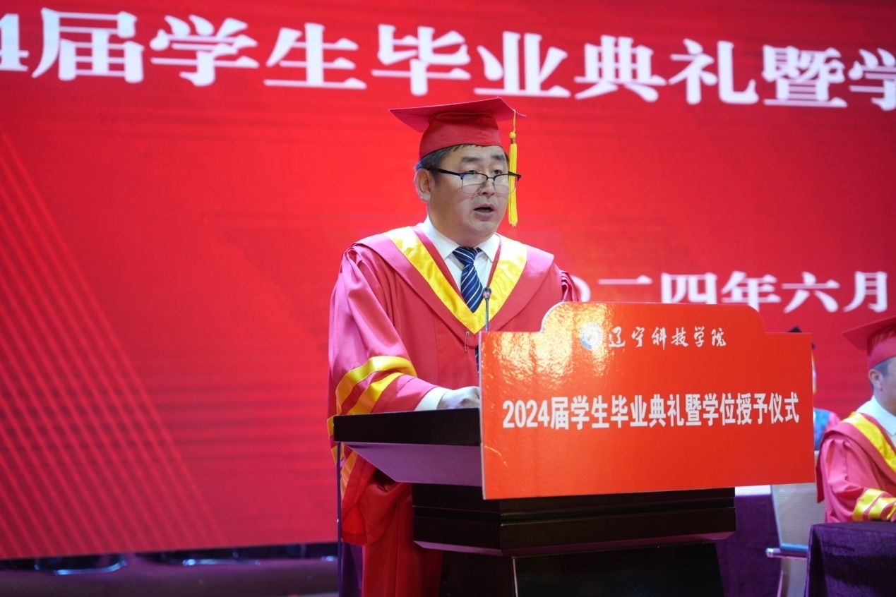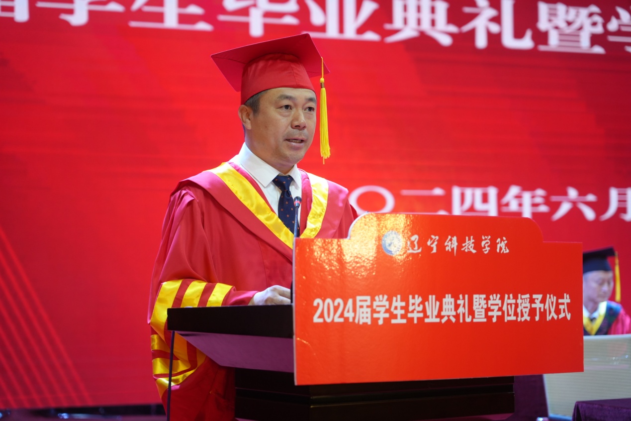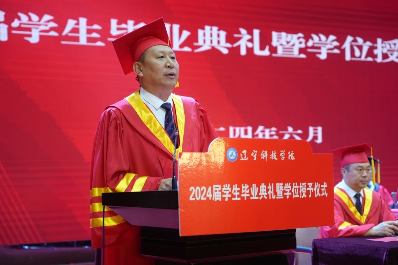 校长李卫民教授发表题为《以奋斗之姿 赴时代之约》的致辞,向圆满完成学业开启人生崭新篇章的毕业生致以热烈祝贺,向一路陪伴、支持他们成长成才的老师和家长们致以崇高敬意。他热情赞扬毕业生们在校期间比学赶超,创优争先,以实际行动展现出“坚韧不拔、百炼成钢”的辽科精神和“明道明德、求新求实”的校训品格。他对毕业生们寄予殷切期盼。一是期待广大辽科学子心怀家国天下,躬身报国之行。践行好“请党放心、强国有我”的青春誓言,回答好“强国建设,青年何为”的时代之问,赓续辽科人血脉中的红色基因,做到心中有丘壑、眼里存山河,主动将“小我”融入“大我”,到祖国最需要的地方去。二是期待广大辽科学子坚持修身立德,涵养浩然正气。牢记“从善如登,从恶如崩”的道理,始终保持积极的人生态度、良好的道德品质、健康的生活情趣,不断修身立德,打牢道德根基,让自己的人生道路走得更正、走得更远。三是期待广大辽科学子永葆学习热情,练就过硬本领。走出“舒适区”,肯下“苦功夫”,甘坐“冷板凳”,以“吾将上下而求索”的精神深入钻研学问,以“千磨万击还坚劲”的韧性坚持探索未知,以“纸上得来终觉浅”的觉悟积极投身实践,知行合一、守正创新,创造出属于你们自己的精彩人生。