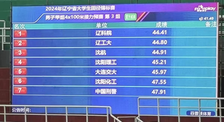 在7月25日上午进行的共有22所学校参加的男子甲组4×100米接力预赛中,来自资源与土木工程学院的迟增林、史家驹、姚旭和宋荣鑫四位选手配合默契,以44.41秒的成绩顺利进入决赛。在7月26日上午的决赛中,4名辽科学子团结协作,以43.80秒的优异成绩打破了尘封我校18年的学男45.19秒4×100米接力纪录,夺得冠军。