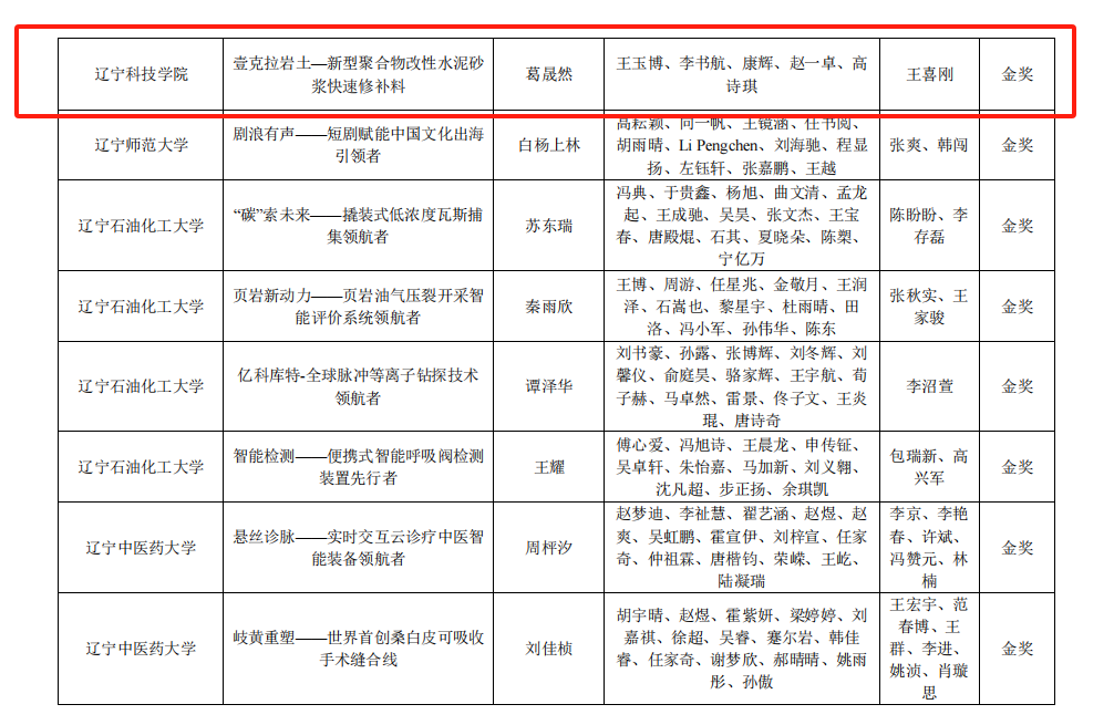 经过校级初赛、省级复赛与决赛的层层角逐,学生们踏实刻苦,砥砺前行,在路演答辩之中尽展青春洋溢之貌,用创意散发出青春最闪耀的光芒,彰显了“明道明德、求新求实”的辽科校训和“坚韧不拔、百炼成钢”的辽科精神。最终我校在“建行杯”辽宁省大学生创新大赛(2024)中共获奖51项,为历年最好成绩,其中“壹克拉岩土——新型聚合物改性水泥砂浆快速修补料”获得省级金奖。