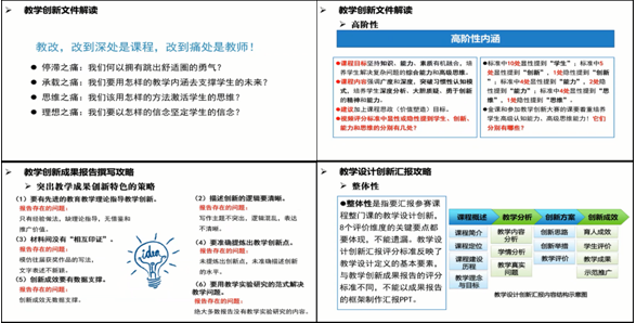 李万明教授以丰富的案例和精彩的问题剖析,结合对教创赛的深刻理解及成功实践,从教学创新文件解读、教学创新成果报告撰写攻略、教学设计创新汇报攻略等三个方面,对如何备战教师教学创新大赛、如何真正在教学中做好改革创新进行了有针对性的培训指导。同时耐心解答了老师们在教学创新中的难点和痛点问题,有针对性的传授了创新报告撰写和教学设计说课技巧。参加培训的教师反响热烈,认为本次培训内容丰富、指导性强,有助于提升学校教师教学创新能力和教师大赛参赛水平。