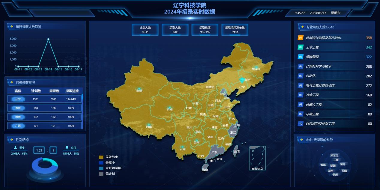 2024年辽宁科技学院专升本报考热度高、关注度大,全部专业普通类专升本计划第一志愿全部招满,录取新生1449人,录取率创近年新高。生源质量较去年大幅提升,高分生源井喷式增长,各专业最高分均在570 ,其中电气工程及其自动化最高分高达624分。