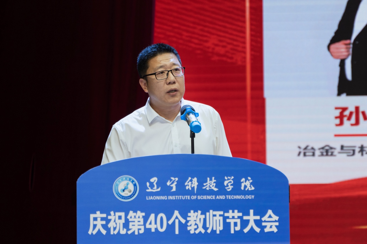 党委书记赵毅在大会上发表讲话。赵毅指出,辽宁科技学院在习近平新时代中国特色社会主义思想指导下,以实干的状态和拼搏的常态努力践行“为党育人,为国育才”的神圣使命,坚持应用型办学特色,深化教育综合改革,着力提升人才培养质量,取得了显著的成绩。全体教师恪尽职守、默默耕耘,为学生的成长成才付出了辛勤汗水,为学校的高质量发展作出了突出贡献。赵毅强调,当前和今后一个时期,是学校发展的关键时期,全体教师一是要以政治坚定、情怀深厚的理想信念铸魂。要学习贯彻好党的二十届三中全会精神,主动思考、认真作答“强国建设,高校何为”“辽宁振兴,辽科何为”的时代命题,坚定心有大我、至诚报国的理想信念,深植于国家和民族大业,将个人职业之“小我”,面向教育事业之“大我”,在实现学校高质量发展中施展抱负、建功立业。二是要以自律自省、品行高尚的道德情操立身。要时刻铭记教书育人的使命,严于律己,从严治教,把师德师风摆在首要位置,以人格魅力引导学生心灵,以学术造诣开启学生的智慧之门,传承弘扬优良教风,锤炼“钢铁品质”,以德立身、以德立学、以德施教。三是要以改革创新、格局宏大的广泛学识立学。要不断拓展知识视野、更新理念方法,以学校本科教育教学审核评估和硕士点建设单位申报工作作为“校之要事”“校之大事”,练就过硬本领,提升专业能力,坚定当好深化教育综合改革的实干家,努力成为业务精湛、学生喜爱的高素质教师,使学校特色化、差异化、应用型发展之路行稳致远。四是要以乐教爱生、甘于奉献的仁爱之心树人。要与学生建立良善、信任、尊重的关系,以满腔赤诚的心投入教育事业,用纯粹无私的爱助力学生成才,弘扬辽宁“六地”红色文化,秉承“明道明德、求新求实”的辽科校训,讲好“坚韧不拔、百炼成钢”的具有辽科气质的红色故事,用心用情用爱涵育润泽学生的心灵,实现知识技能传授和思想价值引领的有机统一,引领学生担起强国复兴、振兴发展的时代大任。