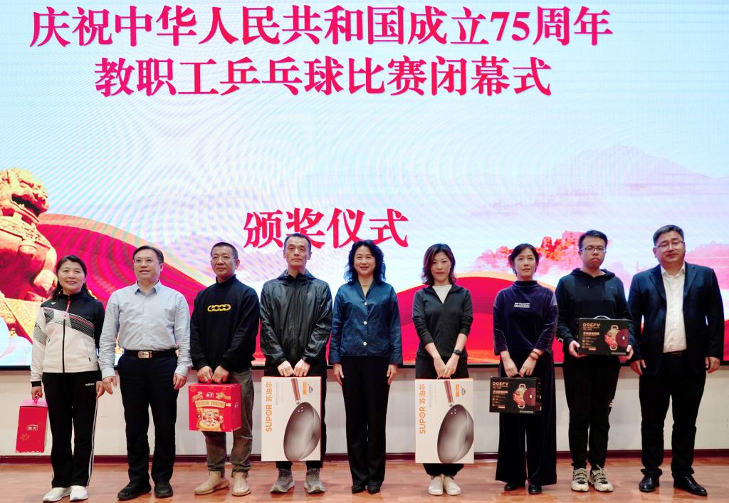 闭幕式上,校党委副书记宋明凯致辞。他向在本次比赛中勤奋拼搏、取得优异成绩的运动员表示祝贺,向辛勤工作的裁判员和工作人员表示诚挚的感谢。他指出,此次乒乓球比赛是一场充满激情与活力的体育盛宴,运动员们用汗水和拼搏诠释了“坚韧不拔、百炼成钢”的辽科精神,用团队和协助展现了体育精神的内涵。本次活动不仅丰富了教职工的业余生活、增进了友谊,更是全体教职工以拼搏进取的姿态,献给伟大祖国75岁生日的一份厚礼,为校园营造了浓厚的节日氛围。他希望全体教职工,弘扬体育精神、树立团队意识,以积极向上、勇于拼搏的运动精神,在学校教育教学审核评估和硕士点申报的关键时期继续奋斗、持续努力,助力学校事业高质量发展。他勉励全体教师要牢记立德树人使命,引导学生加强体育锻炼,锻造青年学生的健康人格,为培养德智体美劳全面发展的社会主义建设者和接班人贡献力量。