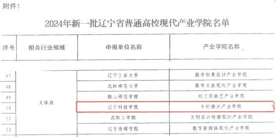 近日,辽宁省教育厅发布了《关于公布2024年省级现代产业学院名单的通知》(辽教通〔2024〕393号),辽宁科技学院乡村振兴产业学院获批2024年辽宁省普通高校现代产业学院。
