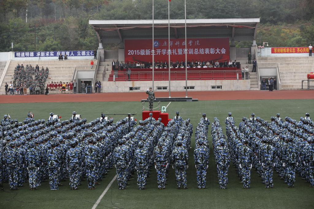开学典礼结束后进行了军训总结表彰。纪委书记邓献宇在参训部队指挥员的陪同下检阅了2015级全体参训学生。受阅方队精神饱满,热情高涨,以严整的军姿、昂扬的精神迎接检阅。