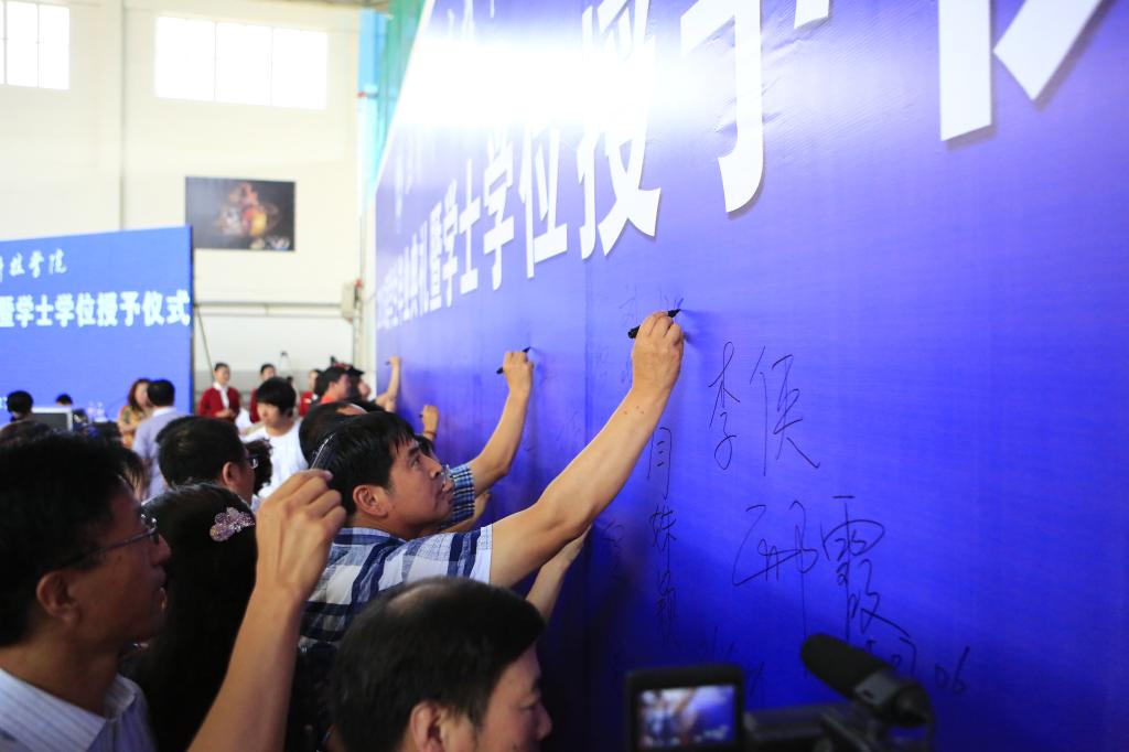 离歌又响,校歌昂扬,鼓舞的是科学报国、热血铸忠诚的辽科学子。场馆内外人头攒动,气氛庄重而热烈,2015届毕业生满怀喜悦地依次登上授位台,校长分别为在场每一位毕业生颁发了学位证书,拨正学士帽上的流苏,合影留念,毕业签名墙前,大家纷纷签名留念。更有多位毕业生,领完证书后与校长们互相拥抱。那一瞬间,那一个浅浅的拥抱,饱含大学期间所有的酸甜苦辣;成长背后的喜怒哀乐,全部化作深深的爱意,融进彼此心底。