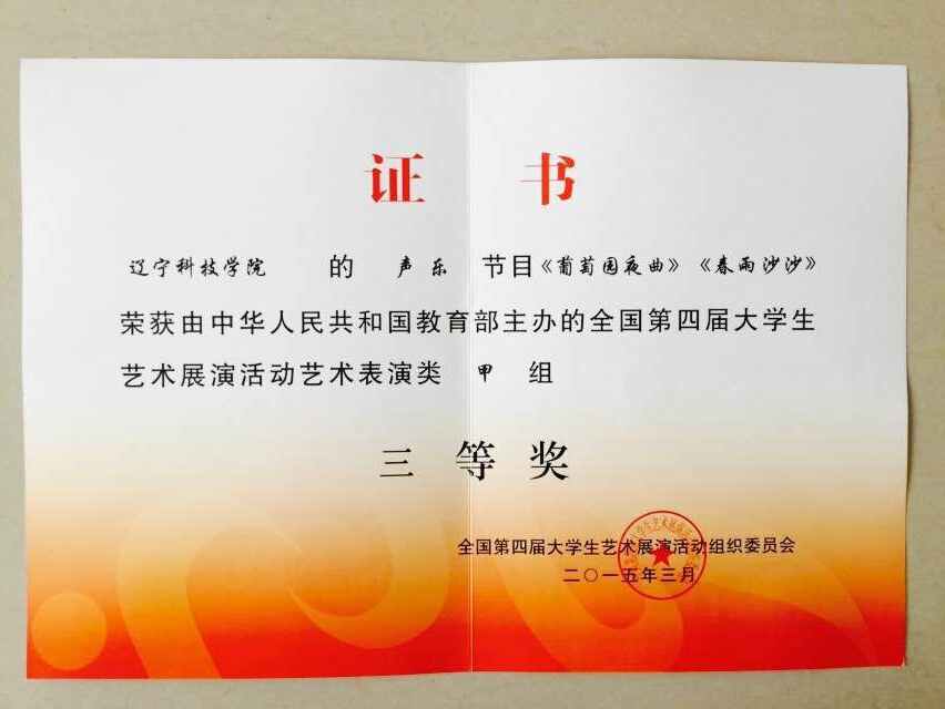 近日,在由国家教育部主办的全国第四届大学生艺术展演活动中,我校团委书记韩娇、贾巍老师指导的声乐类节目《葡萄园夜曲》《春雨沙沙》荣获国家级艺术表演类甲组三等奖。