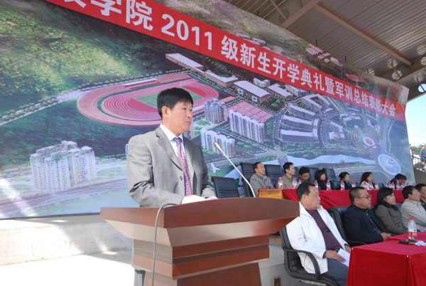 9月18日,我校隆重召开2011级新生开学典礼暨军训总结表彰大会, 3200余名新生在运动场集会,共同庆祝2011级新同学开启人生新篇章。党委书记温景文,校长、党委副书记赵文珍,党委副书记朱新宁,副校长吴国玺、韩劲松,校长助理相玉红,军训团团长王志辉少校出席大会。大会由党委副书记朱新宁教授主持。
