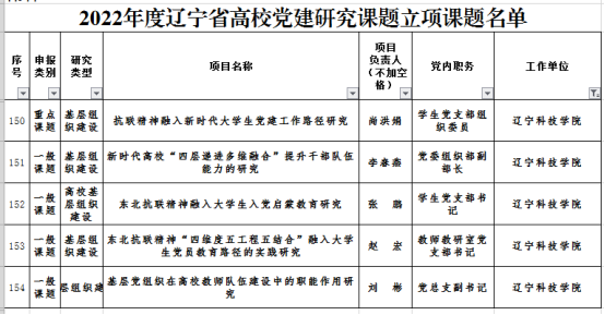 近日,2022年度辽宁省高校党建研究课题立项课题名单公布,我校5项党建研究课题获得省级立项。其中,由尚洪娟老师牵头负责的《抗联精神融入新时代大学生党建工作路径研究》获批重点课题,由李春燕、张鹏、赵宏、刘彬分别牵头负责的4个课题获批一般课题立项。电气与信息工程学院(现电气与自动化工程学院)学生党支部继成功入选第三批全国党建工作“样板支部”培育创建单位后又荣获2022年辽宁省高校“校园先锋示范岗”(集体)。截至目前,我校已有46项课题获批辽宁省高校党建研究项目,4个基层党组织被评为省级“校园先锋示范岗”(集体)。