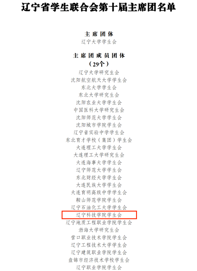 日前,辽宁省学生联合会第十次代表大会在沈阳开幕。辽宁科技学院成功当选为辽宁省学生联合会第十届主席团成员团体,我校正式代表、校学生会主席团成员李凌霄同学作为辽宁学联第十届代表大会本溪市代表团团长和辽宁学联第十届主席团成员参会。
