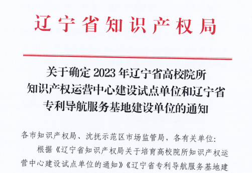 近日,从辽宁省知识产权局获悉,确定我校为2023年辽宁省高校院所知识产权运营中心建设试点单位,建设试点期为2023年至2025年。
