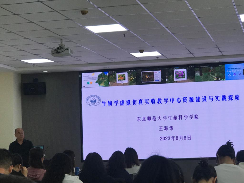 东北师范大学生命科学学院党委书记、教授、博士生导师、吉林省鸟类生物与保护遗传工程实验室负责人王海涛从实验教学中心的发展历程、虚拟仿真一流本科课程的建设及相关政策、东北师范大学生物虚拟仿真实验教学中心建设及虚拟一流本科课程的申报经验四个方面作了《生物学虚拟仿真实验教学中心资源建设与实践探索》报告。课上,王海涛分享了主持3门虚拟仿真国家一流本科课程的经验,推荐了“实验空间”国家平台,对我校教师虚拟仿真一流本科课程的申报等具有指导作用。