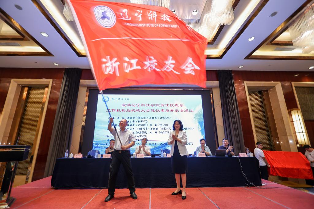 校长、校友总会会长李卫民与新任浙江校友会会长潘永贵共同为辽宁科技学院浙江校友之家揭匾。党委副书记、校友总会常务副会长赵毅代表校友总会为浙江校友会授会旗。