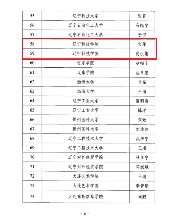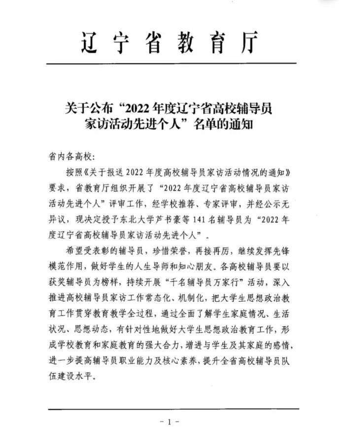 按照《关于报送2022年度高校辅导员家访活动情况的通知》要求,省教育厅组织开展了“2022年度辽宁省高校辅导员家访活动先进个人”评审工作,经学校推荐、专家审核,确定全省141名辅导员为“2022年度辽宁省高校辅导员家访活动先进个人”。我校辅导员宫萍、尚洪娟荣获“2022年度辽宁省高校辅导员家访活动先进个人”荣誉称号。