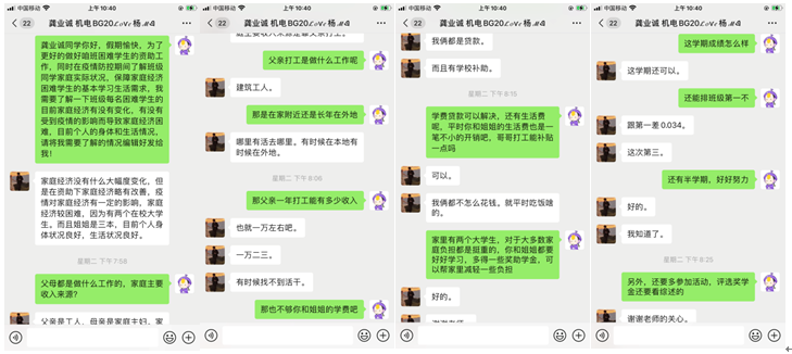 在家访工作中,宫萍、尚洪娟在选择家访对象、精准剖析原因、注重家访效果、总结家访规律上下功夫,通过线上家长会、电话连线、微信视频面对面、实地入户走访等方式,落实立德树人根本任务,践行辅导员工作的初心使命。她们用心聆听、用爱敲门、用情感染,帮助学生解决实际困难,积极传递学校温暖关怀,切实增强家校育人合力。