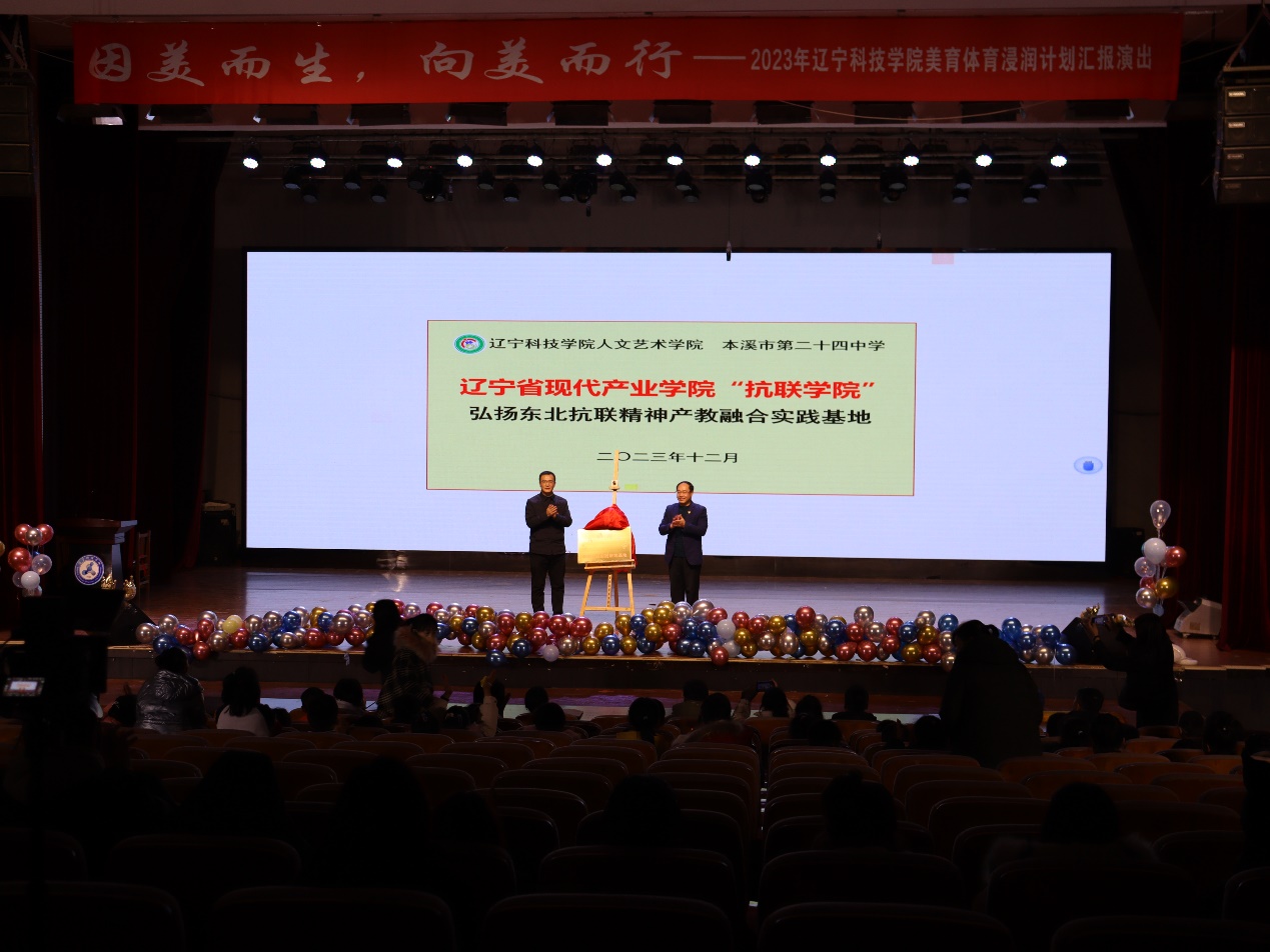 辽宁科技学院党委宣传部、党委统战部部长唐羽与本溪市二十四中学校长程显露共同为共建辽宁科技学院美育浸润计划教育基地揭牌。人文艺术学院党总支书记朱军楠与本溪市二十四中学校长程显露共同为共建辽宁省现代产业学院“抗联学院”弘扬东北抗联精神产教融合实践基地揭牌。本溪市二十四中学副校长杨文君向辽宁科技学院美育体育浸润计划教师代表唐羽、张瑞瑛授旗。