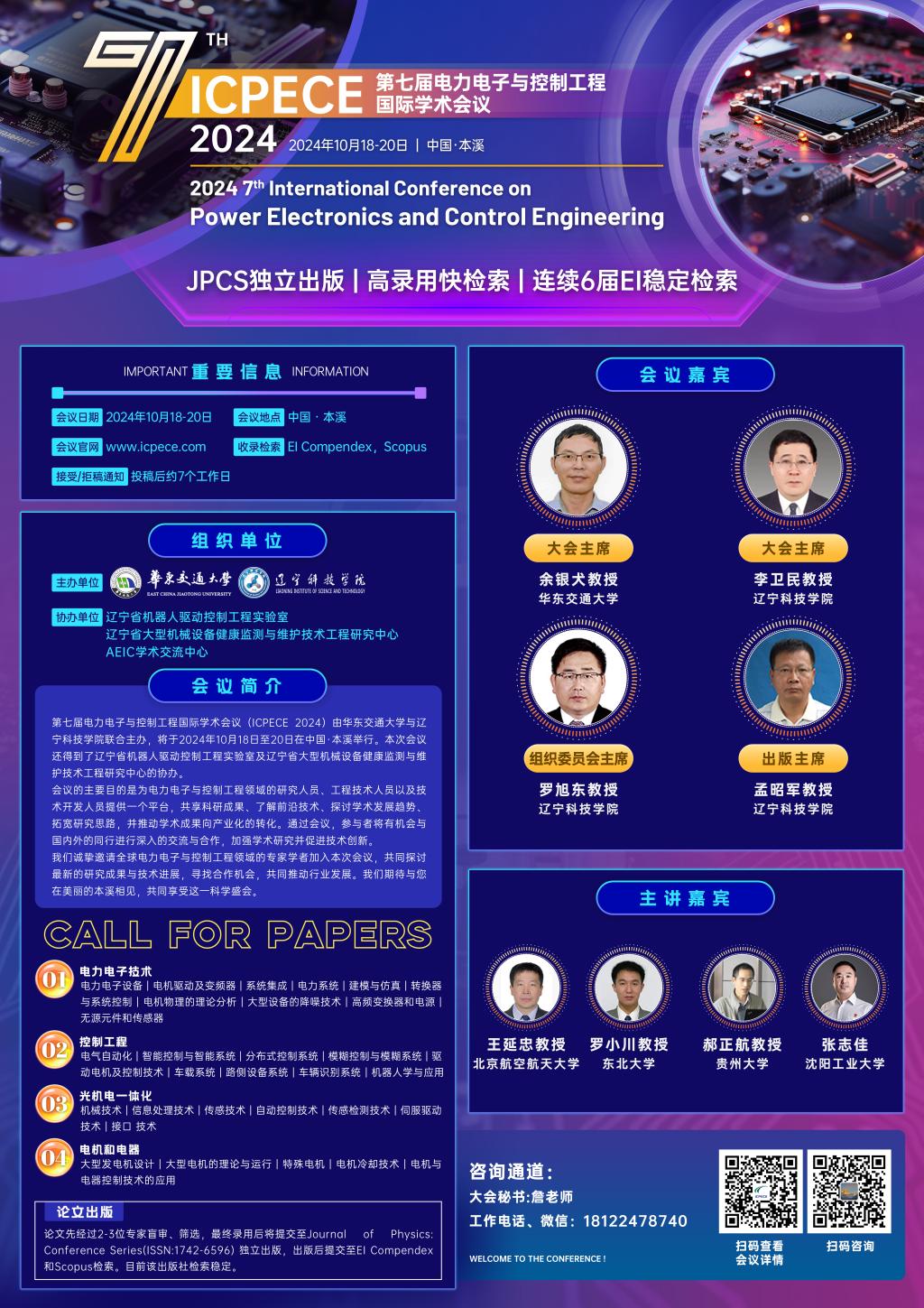 由华东交通大学与辽宁科技学院联合主办、辽宁省机器人驱动控制工程实验室及辽宁省大型机械设备健康监测与维护技术工程研究中心、aeic学术交流中心协办的第七届电力电子与控制工程国际学术会议(icpece 2024)将于2024年10月18日至20日在中国本溪举行。会议将为电力电子与控制工程领域的研究人员、工程技术人员以及技术开发人员提供一个平台,共享科研成果、了解前沿技术、探讨学术发展趋势、拓宽研究思路,并推动学术成果向产业化的转化。通过会议,参与者将有机会与国内外的同行进行深入的交流与合作,加强学术研究并促进技术创新。我们诚挚邀请全球电力电子与控制工程领域的专家学者参加本次会议,同时欢迎相关研究领域的高质量研究论文和演讲报告。