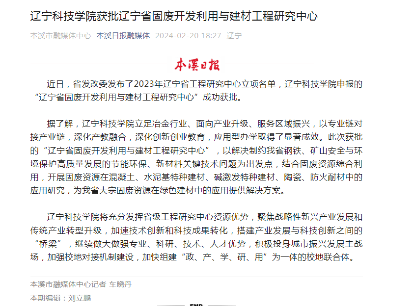 【本溪日报融媒体】辽宁科技学院获批辽宁省固废开发利用与建材工程研究中心-5177棋牌