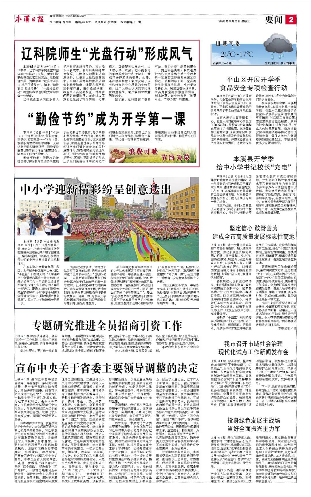 《本溪日报》2020年9月2日第二版报道我校师生积极相应号召,开展“光盘行动”的情况。
