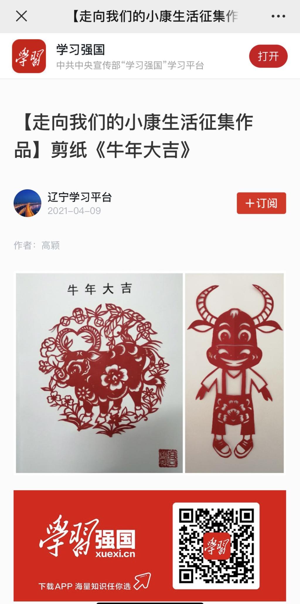 学习强国辽宁学习平台报道我校药化学院高颖老师的剪纸作品《牛年大吉》。
