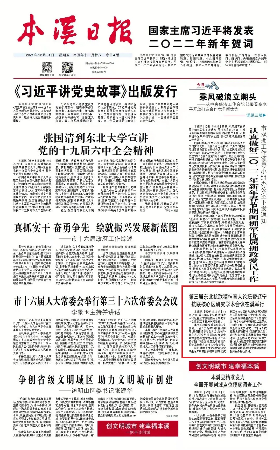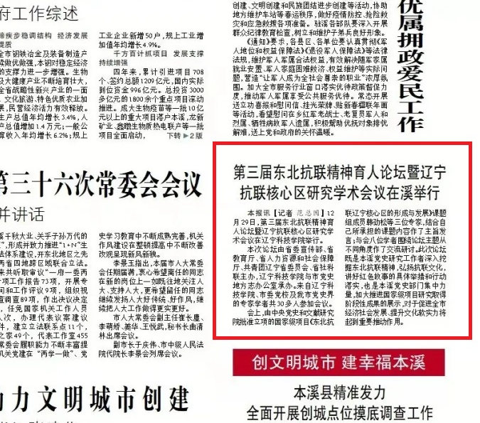 12月31日,本溪日报刊载了由省委宣传部、省教育厅、省人力资源和社会保障厅、共青团辽宁省委员会、省社科联主办,辽宁科技学院与中共本溪市委党史地方志办公室承办的第三届东北抗联精神育人论坛暨辽宁抗联核心区研究学术会议。
