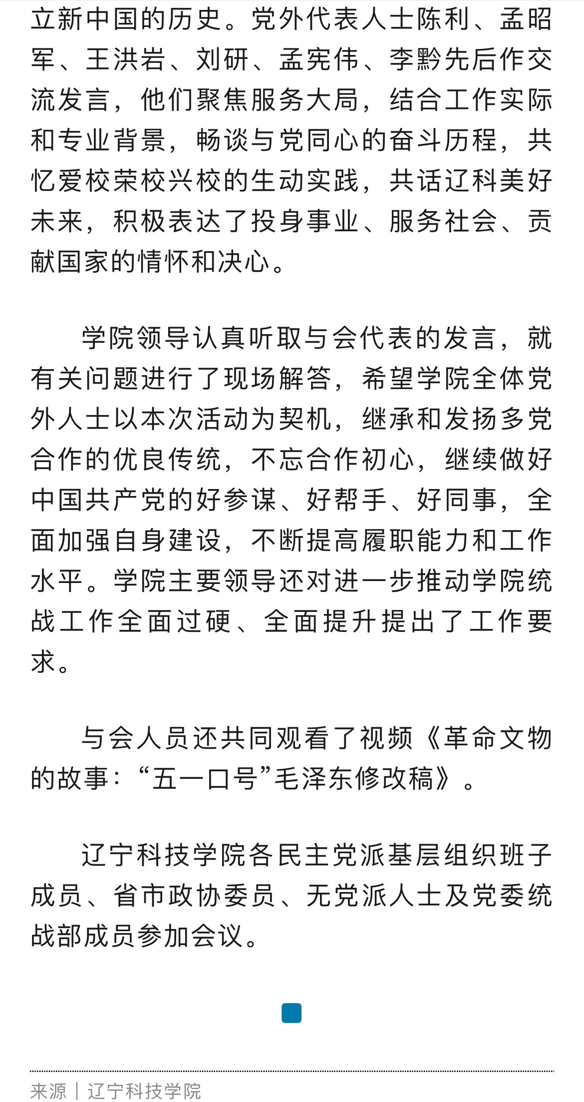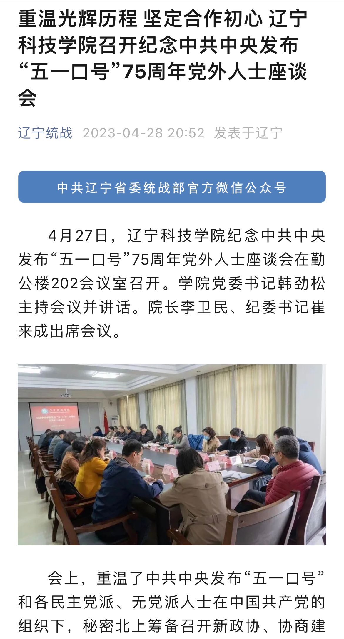 【辽宁统战】重温光辉历程 坚定合作初心 辽宁科技学院召开纪念中共中央发布“五一口号”75周年党外人士座谈会-5177棋牌