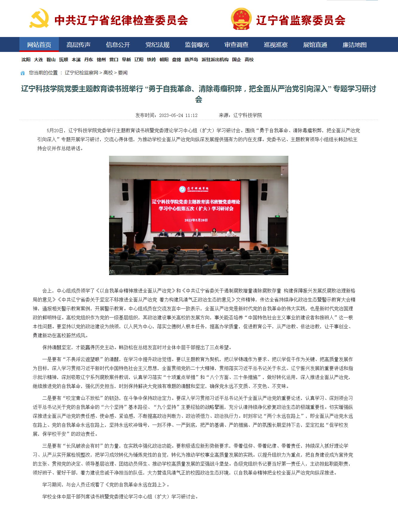 【辽宁纪检监察网】辽宁科技学院党委主题教育读书班举行 “勇于自我革命、清除毒瘤积弊,把全面从严治党引向深入” 专题学习研讨会-5177棋牌
