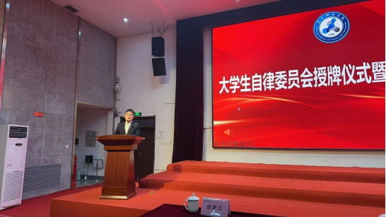 仪式上,为表彰大学生自律委员会的辛勤付出,于红斌、史睿分别为自律委员会副部长及以上学生干部逐一颁发自律委员会名牌。