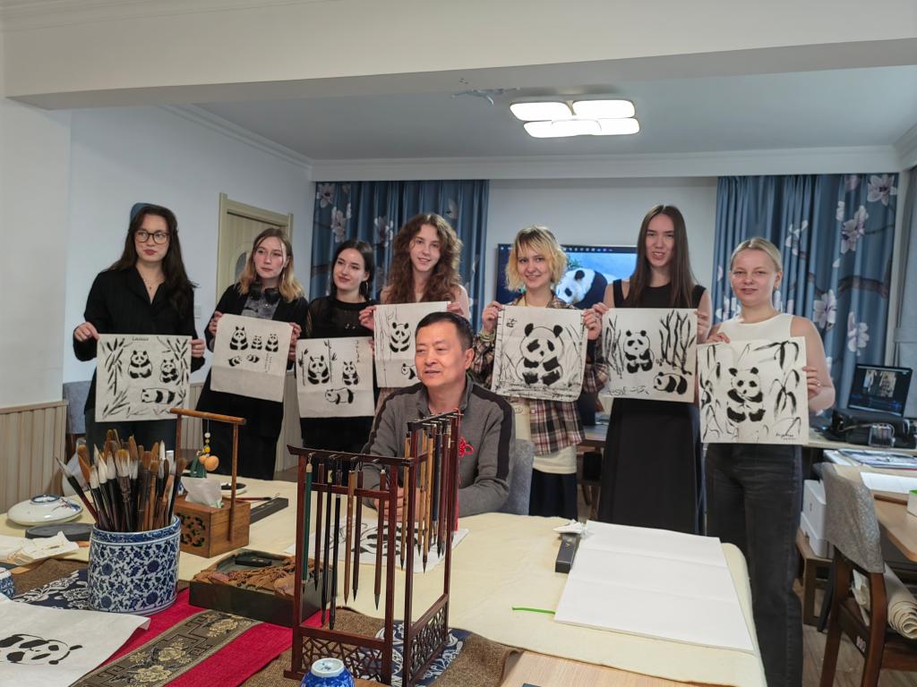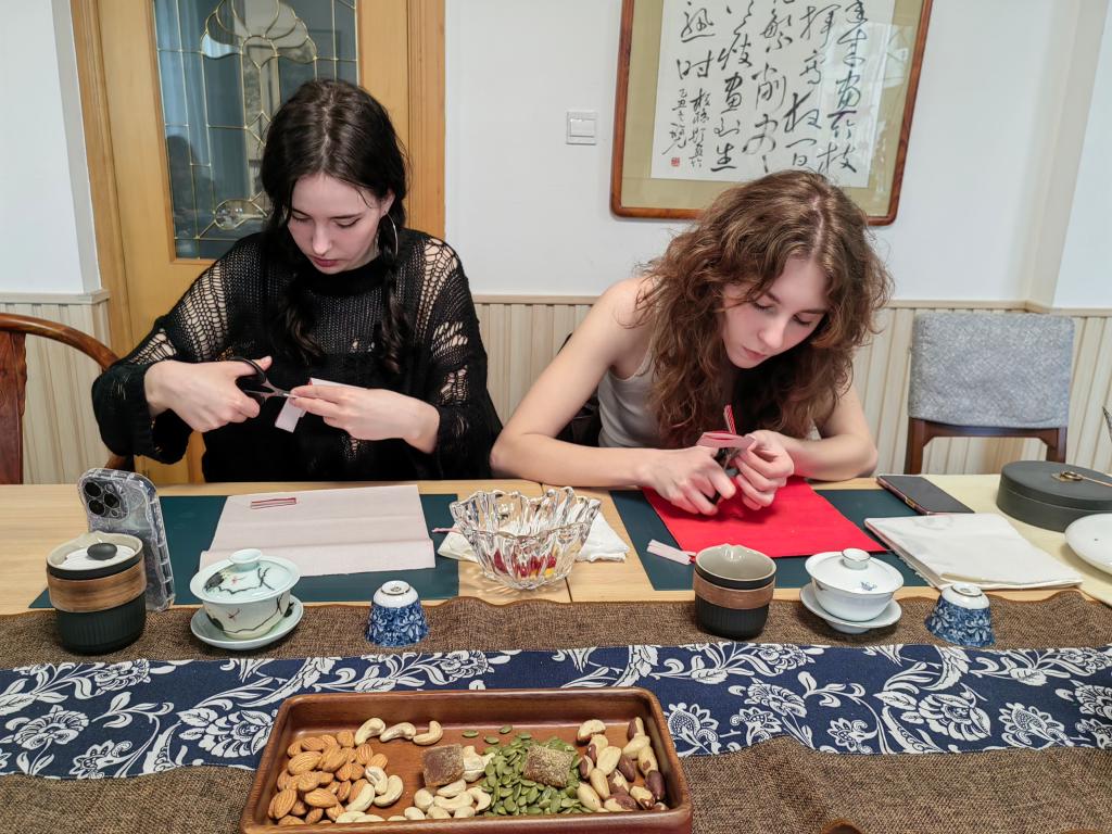 在绘画体验中,学校邀请本溪著名的中国山水画艺术家赵老师现场作画,展示中国山水画的基本技法和创作过程,教会留学生如何欣赏中国山水画代表作品,同时也让她们用笔与墨感知山水自然之美,体验中国画的美妙。在剪纸文化体验中,学校邀请本溪市剪纸艺术家刘老师现场教学,教授留学生剪纸技巧。刘老师绘声绘色地向留学生讲解了“喜”字的文化内涵,通过手把手的示范教学,让留学生学习剪纸的方法和艺术技巧。每一位留学生都用心学习,认真操作,剪出了非常漂亮的作品。