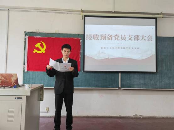 会上,赵鑫达、白云屹等20名发展对象依次宣读《入党志愿书》,向党组织汇报了对党的认识、入党动机、本人履历、家庭和主要社会关系,以及需向党组织说明的问题,并表达了加入中国共产党的强烈愿望。入党介绍人介绍了发展对象的有关情况,并对其能否入党表明意见。支部委员会报告了对发展对象审查的情况,经过充分讨论和无记名投票,与会正式党员一致同意接收赵鑫达等20名发展对象为中共预备党员。