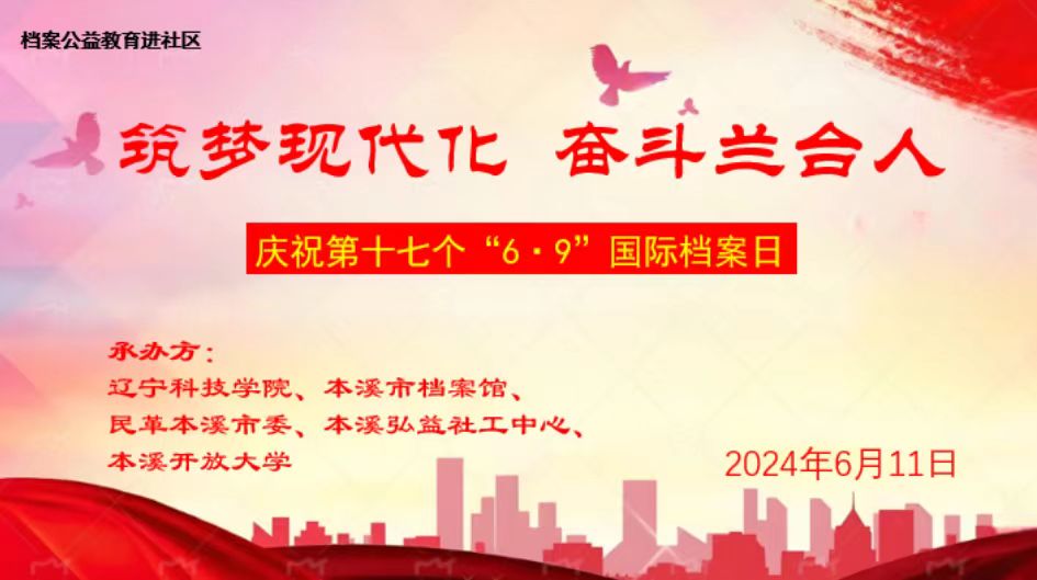 6月11日,为庆祝第十七个“6.9”国际档案日,提升档案事业的社会影响力,经济与管理学院联合本溪市档案馆、民革本溪市委、本溪弘益社工中心、本溪开放大学,在本溪市明山区民建社区,举办了一场主题为“筑梦现代化 奋斗兰台人”的档案公益教育活动。本溪市政协副主席李春,本溪市档案馆馆长韩晓东,我校经济与管理学院档案学专业师生,各参加单位代表、社区居民共计100余人参加活动。活动由经济与管理学院副院长许婷婷主持。
