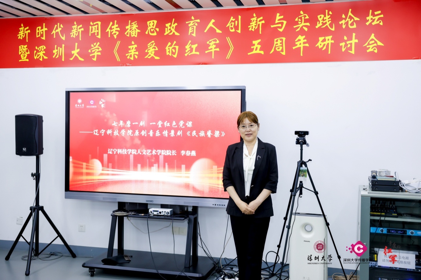 在深圳大学《亲爱的红军》舞台讲演剧五周年研讨会上,李春燕以辽宁科技学院“七年磨一剧,育人铸精品”为主题,介绍了我校的概况、“一主两翼、三业融合”应用型转型发展模式和“东北抗联精神” “钢铁精神”的育人特色。重点通过剧目片段分享,介绍了我校深挖本溪地区丰富深厚的红色资源,创演红色剧目《民族脊梁》。《民族脊梁》运用童谣、独唱、对唱、表演唱、小合唱、合唱、舞蹈及器乐演奏等多种艺术形式,演绎再现了“ 九·一八”事变的历史、“国歌唱响的地方”、东北抗联“西征”、“抗联密营送别”、“刑场就义”等场景,使学生们在舞台上与英雄对话,了解历史、认识国情、开拓视野,砥砺理想与信念,激发爱国主义情感和奋斗志向。我校构建“红色剧目 思政”的育人模式,弘扬革命精神,传承红色基因,用红色文化铸魂育人,为助力辽宁全面振兴培养更多“下得去、用得上、留得住”的应用型人才。