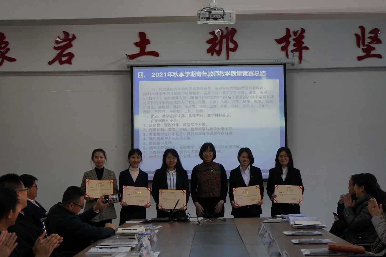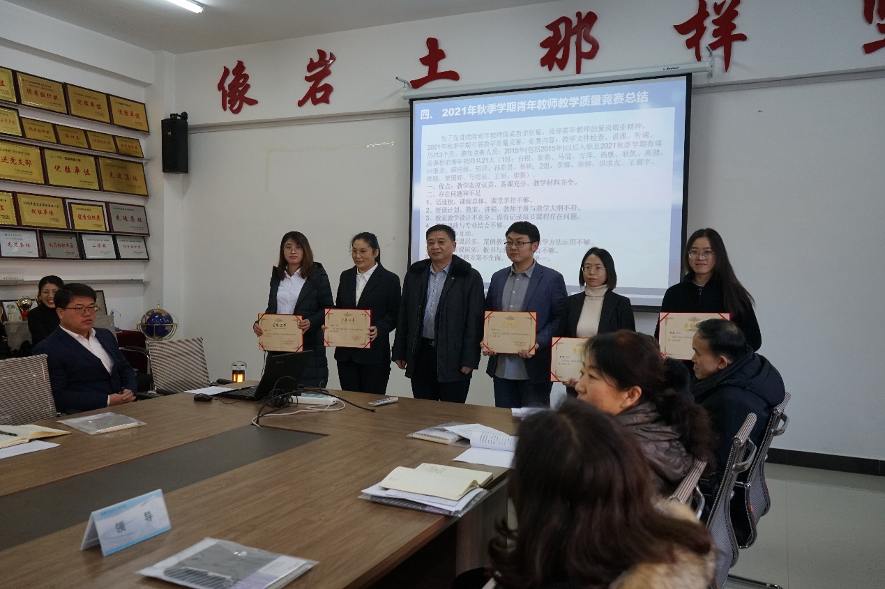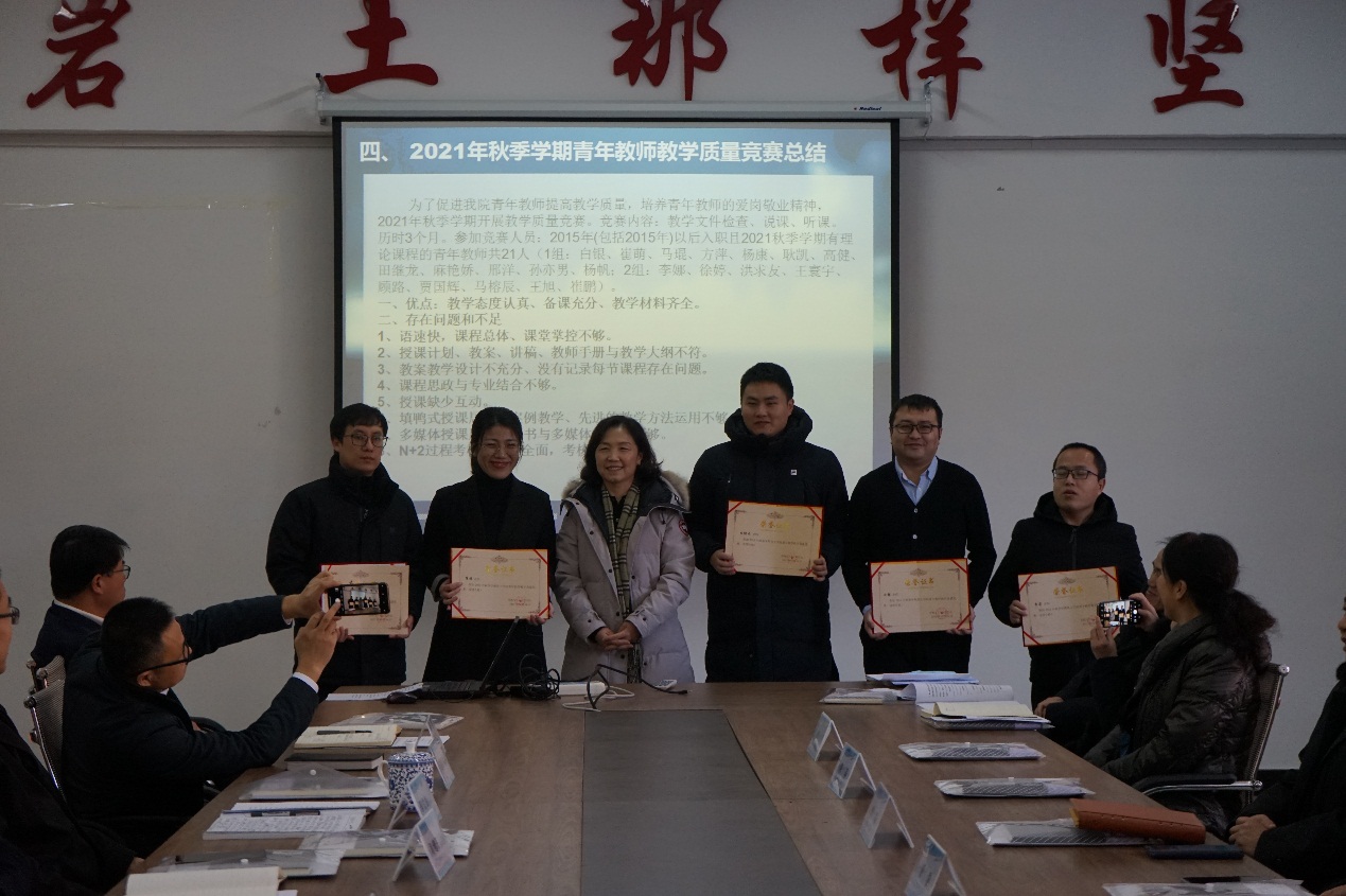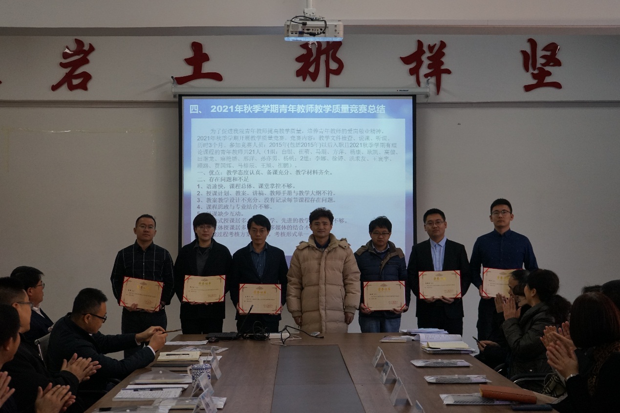 会上,对2021年秋季学期开展的青年教师教学质量竞赛的获奖教师进行了颁奖,孙国军、韩延清、甘晓晔、杜成武分别为获奖教师颁发了获奖证书。