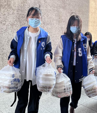 校园里的“蓝马甲”,最美风景线。“疫情就是命令,防控就是责任”“疫情不退,我们不退”是管理学院志愿者的“参战”誓言。面对这场没有硝烟的战争,广大学子主动请缨,率先垂范,身披“战袍”,积极投入抗疫行动,每天为在寝的同学忙碌在各个角落。餐到之前,楼层负责人组织志愿者们有序下楼,排队站好,清点饭菜数量,将需要配送的饭菜按楼层分好,各项工作有条不紊,保证每位同学都能吃到健康、可口的饭菜。温热的饭菜逐一传递到学生们手里,正是这样无比坚定的温暖力量,给所有人带来了莫大的勇气。他们服务细致周到,是同学们的“及时雨”,是春日校园里的最美风景线。旭日初升,散发出的是奋进的光芒,迸发出的是青春的热情。他们是温暖活力的大学生,亦是美好未来的创造者,他们用行动展现力量。