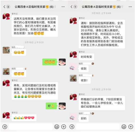 疫情突如其来,局势刻不容缓,为扎实落实学校的防疫政策,保护同学们的身体健康,保障生活正常进行,药化学院闻令而动,迅速组建了公寓四舍a区临时党支部,学院党总支副书记管霞任临时党支部书记。临时党支部从成立那天开始,一方面积极贯彻落实学校的疫情防控各方面要求,一方面切实为同学们生活、学习、看病、就医、考研复试、就业指导等提供快速便捷贴心服务,想学生之所想,急学生之所急——让党旗在疫情防控一线高高飘扬。