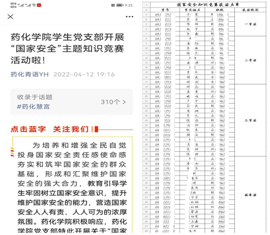 2022年4月15日是第七个“全民国家安全教育日”,为进一步营造宣传国家安全教育,共同维护国家安全的浓厚氛围,教育引导广大师生牢固树立总体国家安全观,筑牢校园安全防线。药化学院先后开展了国家安全教育专题党课学习、国家安全知识问答竞赛、“党旗带团旗——党员宣讲团下基层”等专题活动,引导药化学子了解维护国家安全的重要意义。