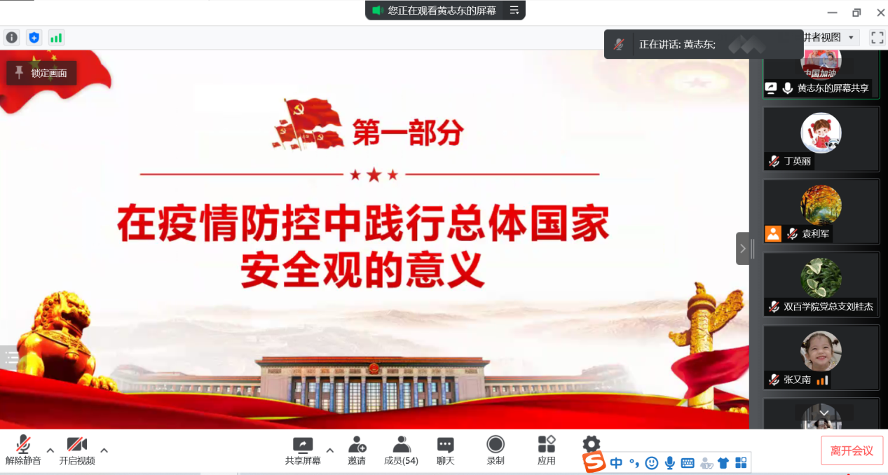 按照省委教育工委《关于组织开展2022年全民国家安全教育日宣传教育活动的通知》和《辽宁科技学院关于开展2022年全民国家安全教育日宣传教育活动的通知》要求,4月13日,中美双百学院组织全体教师和学生党员集体学习习近平总书记关于总体国家安全观的重要论述。教师党支部书记黄志东做题为《在疫情防控中践行总体国家安全观》的党课。