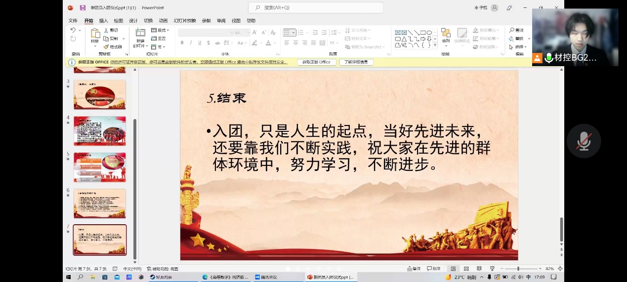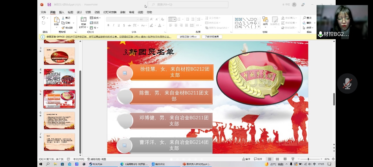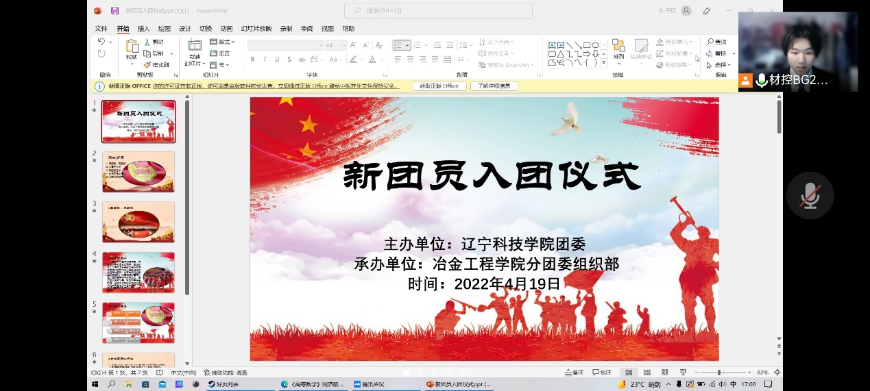 为不断充实壮大冶金工程学院共青团队伍,及时把思想先进、品德优良、学习刻苦的优秀青年吸收到团组织中来,充分发挥共青团组织青年、引领青年、服务青年的积极作用,4月19日下午,冶金工程学院分团委举行了2022年新团员线上入团仪式,五位新团员及所有班级的团支书参加此次仪式。