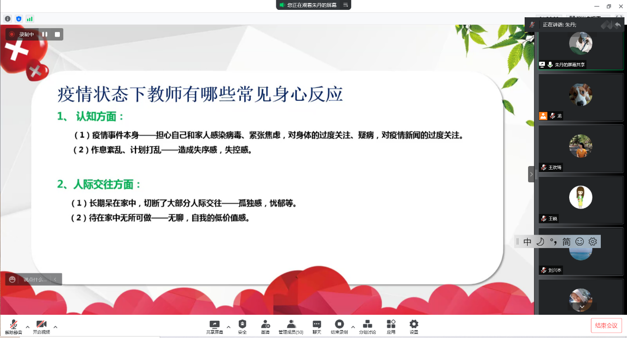 朱丹针对疫情期间教师如何做好个人心理防护、如何在课堂中开展学生的心理调节等两个方面做细致讲解。她指出,疫情期间教师必须要做到三个“用心”。一是用心引导。倡导学生及家长以理性平和、积极乐观的心态面对突如其来的疫情反复。在大力宣传疫情防控知识的同时,及时了解学生心理需求,全面普及心理健康、疫情防控知识,为学生戴上“心理口罩”;二是用心疏导。疫情状态下教师面对心理问题时应积极应对,主导主动接纳,适时训练,充分防护,以积极的心态面对疫情,并将积极的生活态度传递给学生,用心感染,用爱浇灌;三是用心教导。呼吁全体老师要时刻关注学生情绪变化,对产生焦虑、压抑等问题的学生重点关注、深入沟通,对有需要沟通的学生及时了解,帮助学生排忧解难。