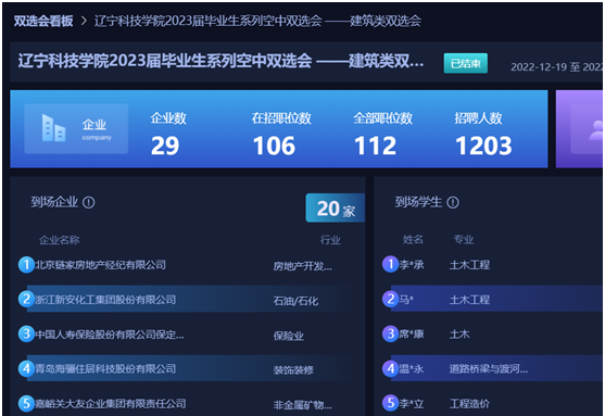 为切实高效地开展此次招聘会,帮助2023届毕业生了解当前就业形势、把握就业机会、实现优质就业。学院主动出击,积极邀请企业参会。最终,共有29家企业受邀参会,发布职位112个,拟招聘人数1203人。双选会采用线上互动的形式,为用人单位和毕业生搭建了安全、高效、便捷的在线交流平台。企业在平台上发布职位需求并收取学生简历。学生通过注册报名、填写简历,查看已报名的企业职位信息并完成简历投递。企业则根据简历投递情况与学生在线沟通并进行视频面试。此次招聘会,共有180名毕业生前来求职、投递简历358份。