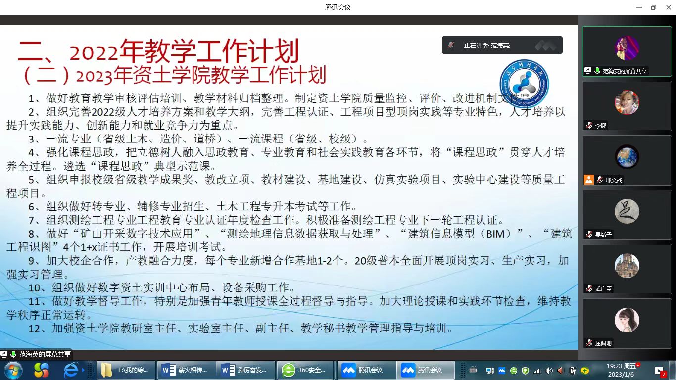 在取得成绩的同时,学院也面临新的挑战,结合学校年度教学工作会议的要求,范海英提出学院2023年度教学工作计划:一是做好教育教学审核评估培训、教学材料归档整理工作。结合评估要求制定资土学院质量监控、评价、改进机制文件。二是进一步完善2022级人才培养方案和教学大纲,完善工程认证、工程项目型顶岗实践等专业特色,人才培养以提升实践能力、创新能力和就业竞争力为重点。三是强化课程思政建设,把立德树人融入思政教育、专业教育和社会实践教育各环节,将“课程思政”贯穿人才培养全过程。做好各类质量工程项目建设工作,持续推进双一流建设。四是加大校企合作和产教融合力度,力争每个专业新增合作基地1-2个。