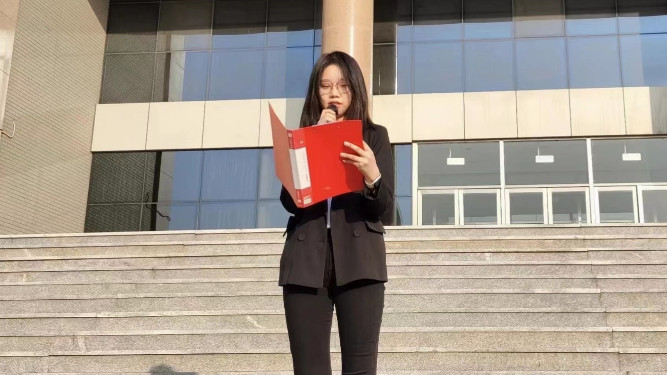 分团委副书记郑依琳作了“青春践行党的二十大 踔厉奋发开启新征程”的主题演讲。她在演讲中向同学们讲述了习近平总书记在党的二十大中对全体青年的勉励:广大青年应坚定不移听党话、跟党走,怀抱梦想又脚踏实地,敢想敢为又善作善成,做有理想、敢担当、能吃苦、肯奋斗的新时代好青年。