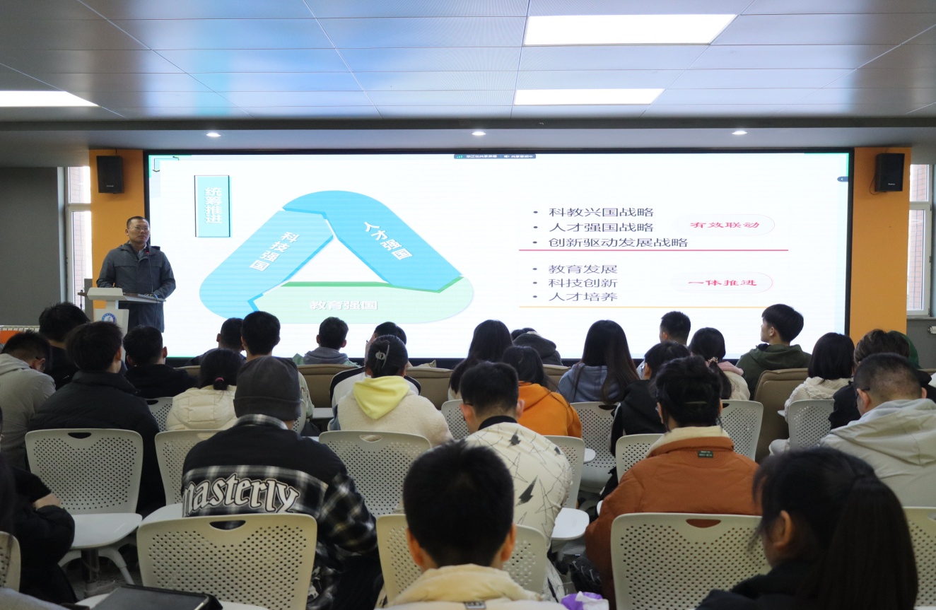 安长伟以《加快建设教育强国、科技强国、人才强国》为题,分别从“着眼长远发展的重大抉择”“铸就强国建设的坚实基础”“加快强国建设的战略部署”“充分发挥高校的重要作用”四个方面向同学们讲述了我国是如何推进“教育强国、科技强国、人才强国”一体化发展的。安长伟向同学们解释了教育、科技、人才三者之间的关系,用近年来中国在建设科教强国中的巨大成就的例子来突出我国科教水平实现了历史性跨越,讲解了加快建设科教强国的战略部署和建设科教强国的中国方案。课上,安长伟重点强调了高校是建设科技、教育、人才强国的中坚力量,国家出台了许多激励政策,鼓励广大高校师生创造出更加辉煌的科研成果,希望同学们抓住历史机遇、迎接时代挑战,成为推动国家建设、民族复兴的中坚力量。